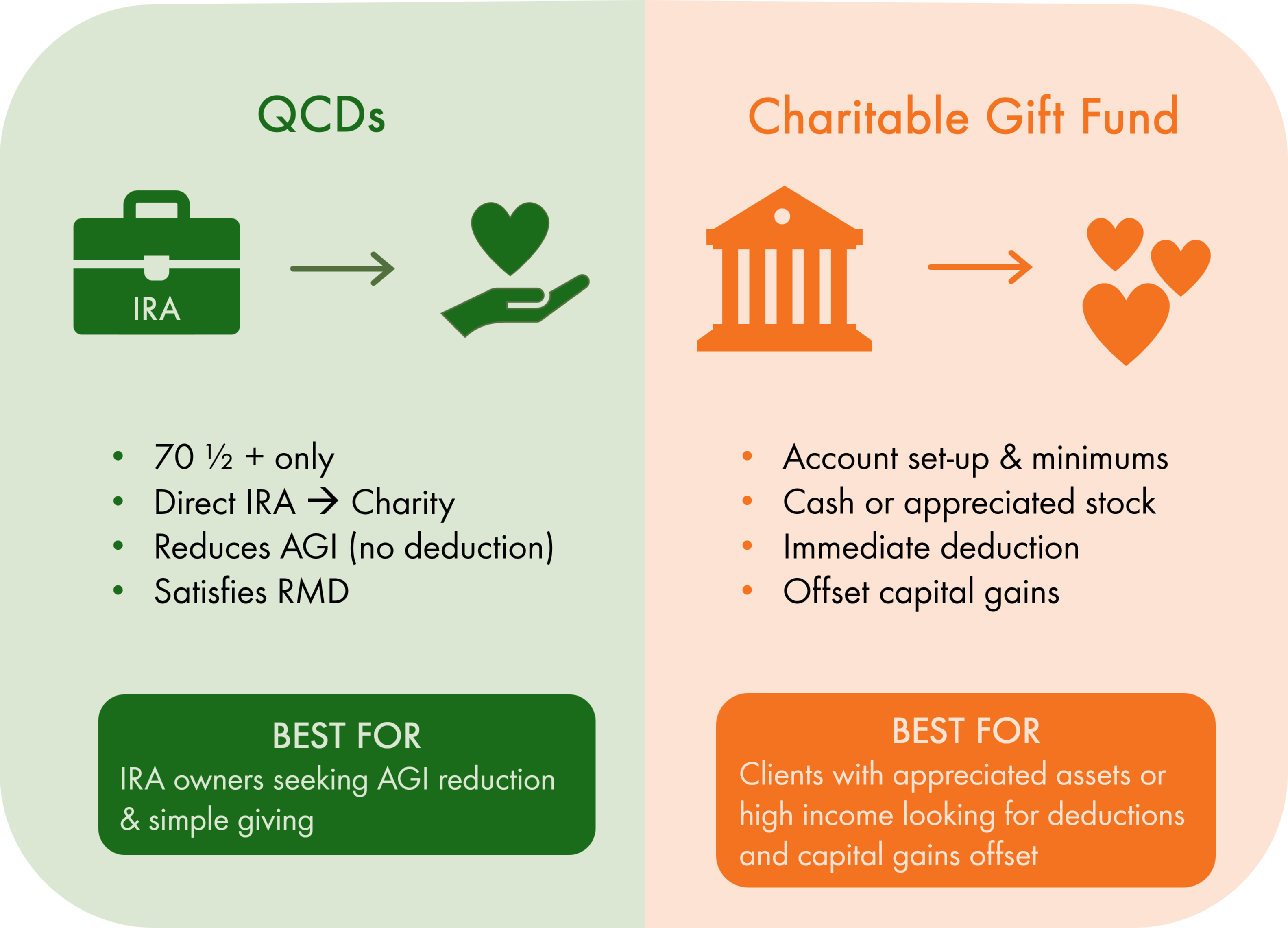 QCDs let you give directly from your IRA to a charity, helping reduce taxable income while also satisfying required minimum distributions. Charitable Gift Funds are dedicated charitable accounts, held outside of your direct ownership, that you can fund with cash or appreciated assets. They provide an immediate tax deduction and the flexibility to support charities over time.