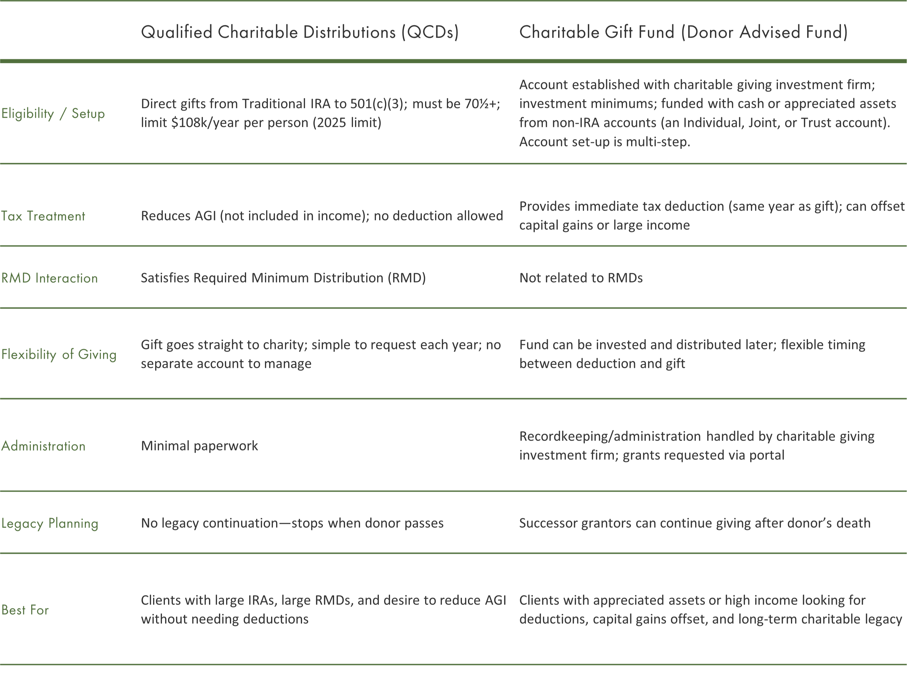 Your savings can empower you to support meaningful causes—and the method you choose can have important financial benefits. Two popular ways—Qualified Charitable Distributions (QCDs) and Charitable Gift Funds (Donor Advised Funds)—offer very different benefits. Understanding how each works can help you choose the path that best fits your goals, whether that’s lowering taxes, simplifying your giving, or leaving a lasting legacy.