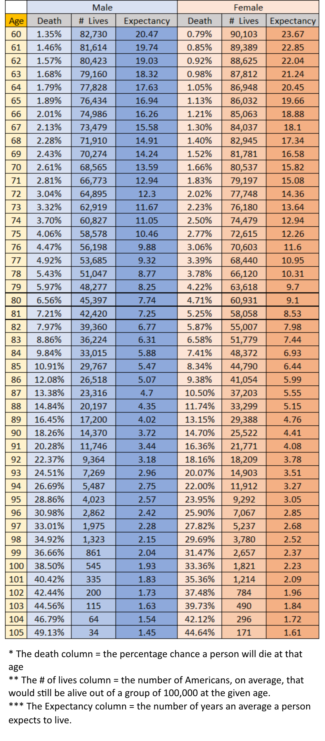 The Mortality Table illustrates life expectancy of Males & Females living in the United States.