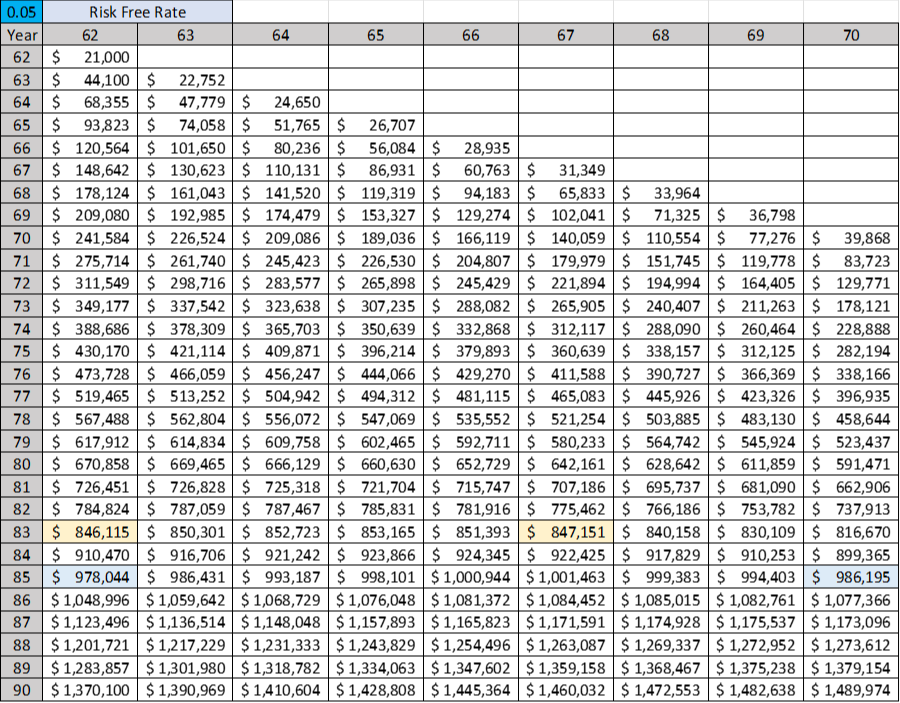 The breakeven rate at age 62 vs. 67 increases from age 77 to 83 (shown in yellow), while the breakeven rate from age 62 vs. 70 increases to age 85 (shown in blue). Given this information, would you hold off on taking social security until 70 given the chance to draw at age 62 knowing that you wouldn’t come out financially better until you are 85 years old? While this doesn’t require an immediate or definitive answer, it is supposed to give you something to consider and think through the implications of holding off on taking social security until the latest possible moment.