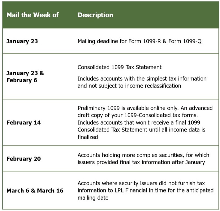 LPL will begin mailing 1099 Consolidated Reporting Statements on January 23, 2026. During the 2025 tax season, 1099 Consolidated Statements will be mailed in several phases in order to meet all IRS deadlines, reduce errors, and reduce the need to mail corrected 1099. 1099s will be posted to Account View approximately 5–7 days prior to the mailing date.
